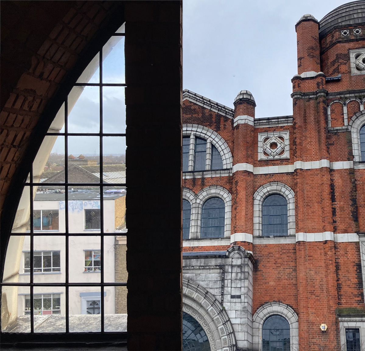 Exterior of Memorial Community Church and view towards the Royal Docks from the studio window