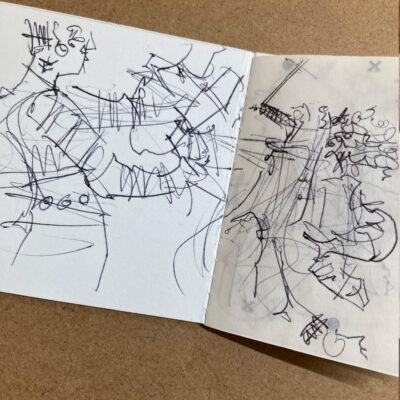 For this day’s sketching, even though I knew the Gantry well, walking it with the show’s organisers had given me useful information on its character and what would be happening where. As always for live sketching, I had brought my designer’s love of materials, sourcing relevant surfaces (who knew you could draw on interfacing), trimming loose paper, stitching tiny sketchbooks and stringing swing tags. So there was a story to tell when the compere asked me up to tell the guests what I’d been up to.