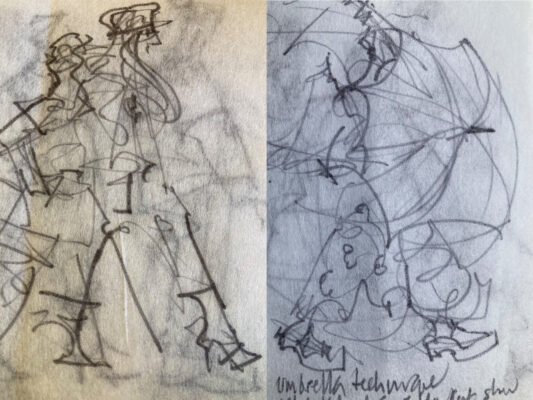 I had asked to cover hair and makeup as well as the show itself. People thought I was taking notes – and in many ways, I was. As I sketched, I noticed how the make-up artists held their brushes; how the hairdressers stood to work; the swish of steaming and assembling garments for each look; the perpetual motion of deft, skilled preparation. I noticed the pride as models stood up from chairs; listened to the confidence-building in rehearsals. As the doors were opened, I sketched the (stylish) arrivals. Then the runway show – and even for someone used to drawing at speed, that was challenging as pairs of models walked and looks crossed over.