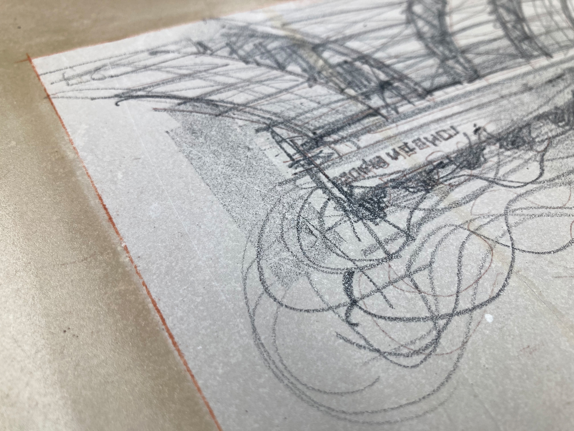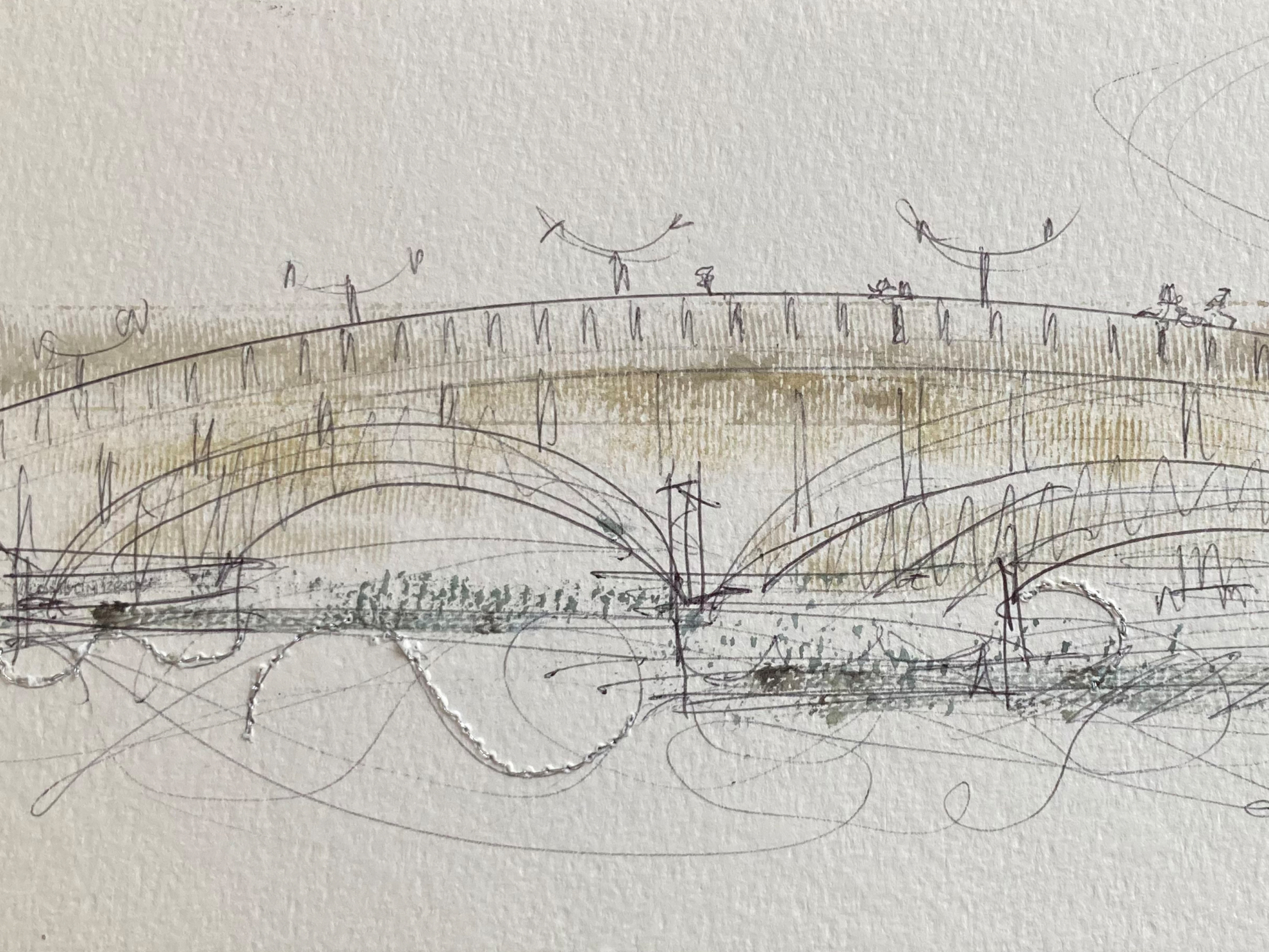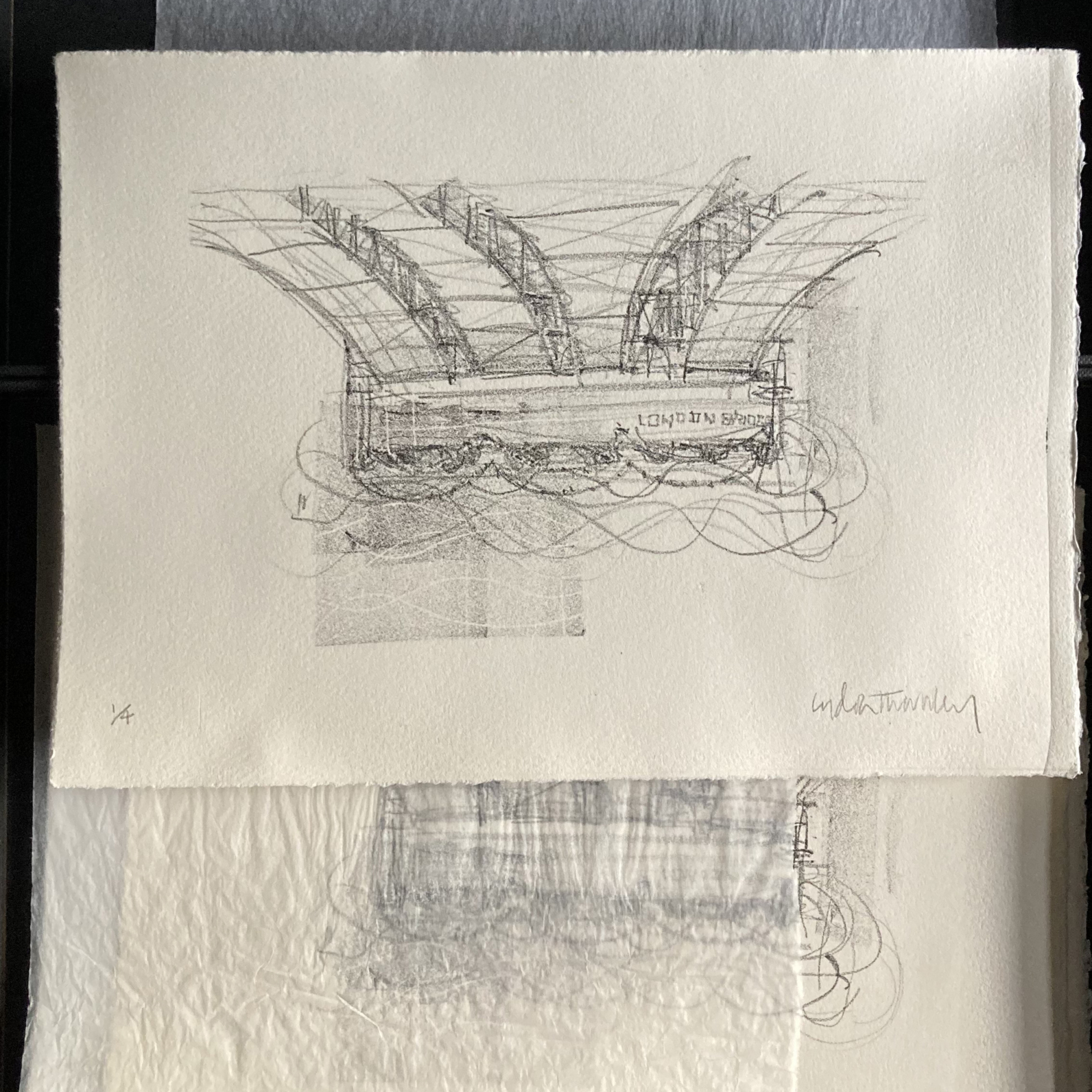 As we spoke of stone, I thought of lithography, which I’d never done. So brain-picking two printmaker friends, I signed up for a workshop at Hausprint with master lithographer Simon Burder. I worked with my sketch from under the bridge, where its design by an engineer is most visible and it meets the curve of the tide in loops of chain, its name carved quietly for those who look. Ground stone to water; stone, water, grease; dampened paper… every part of the process spoke of the bridge as I made a limited edition of four.