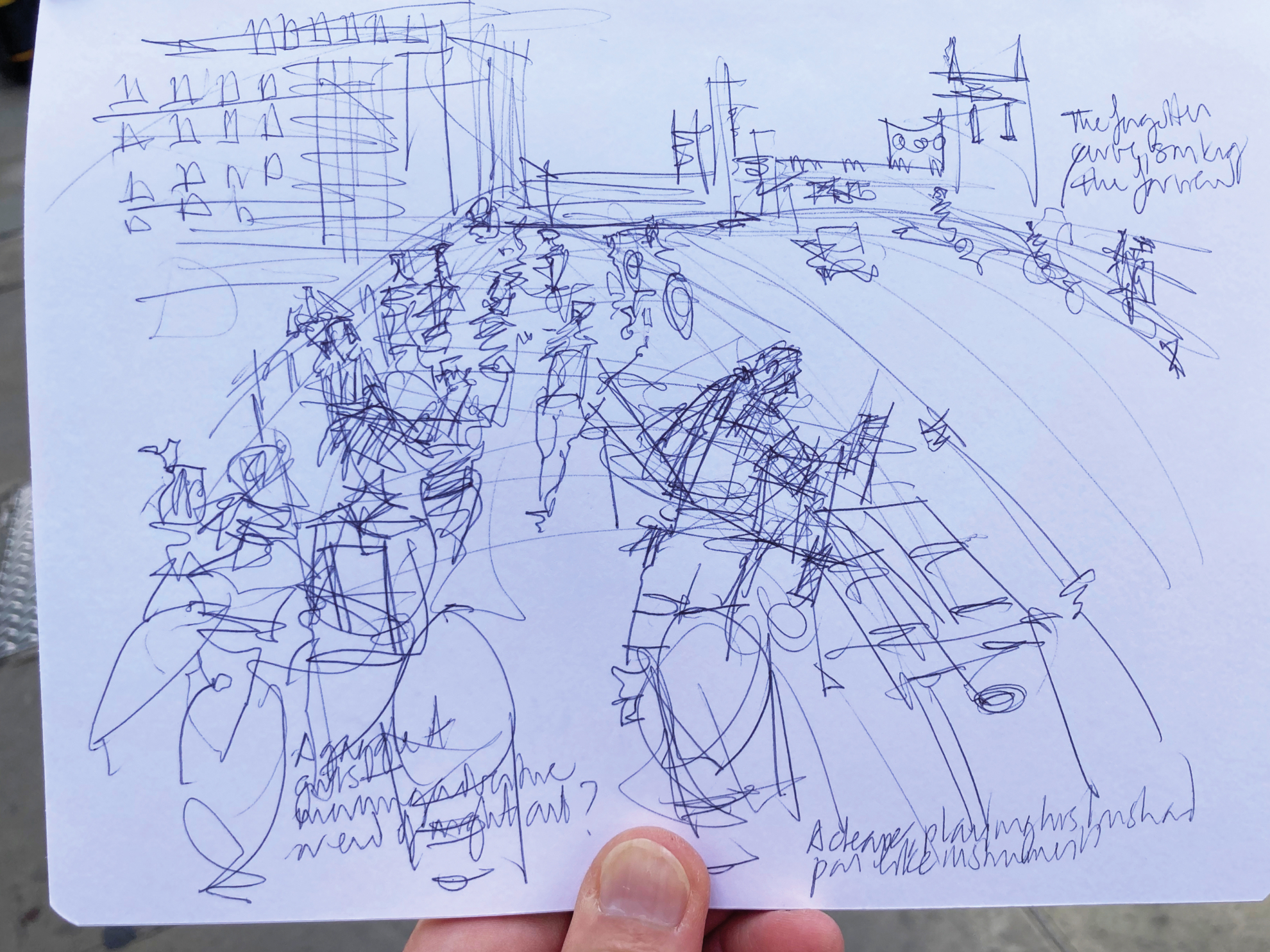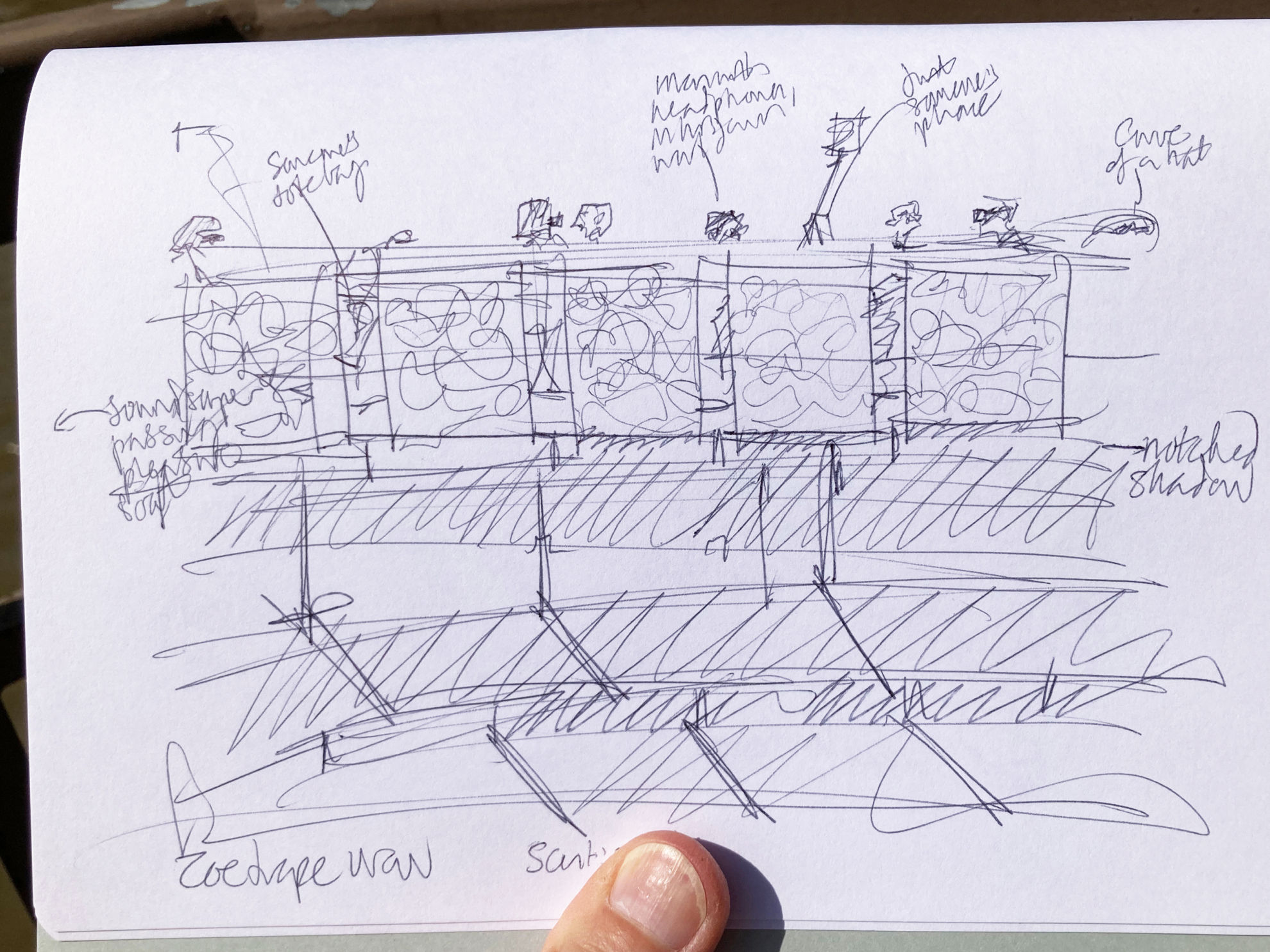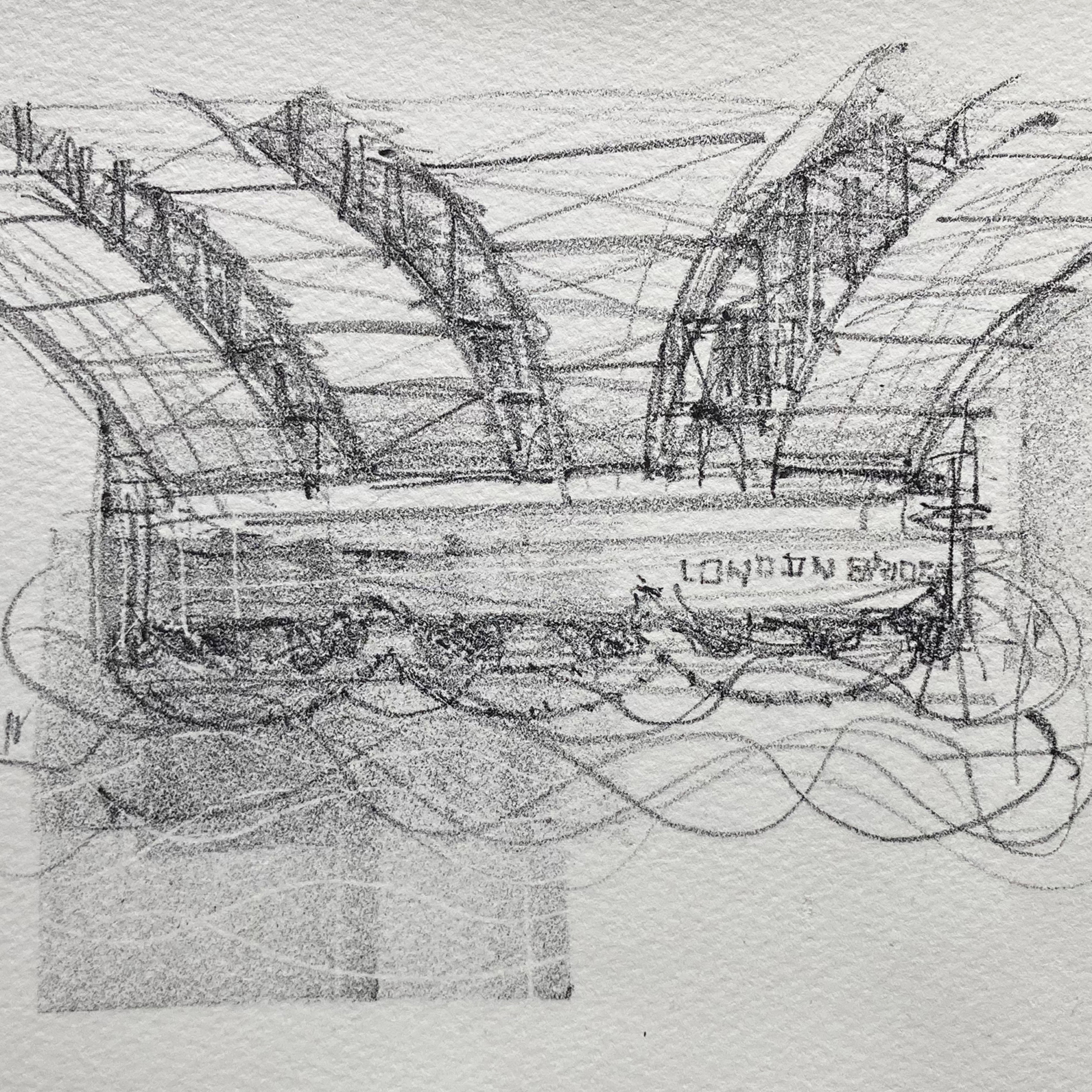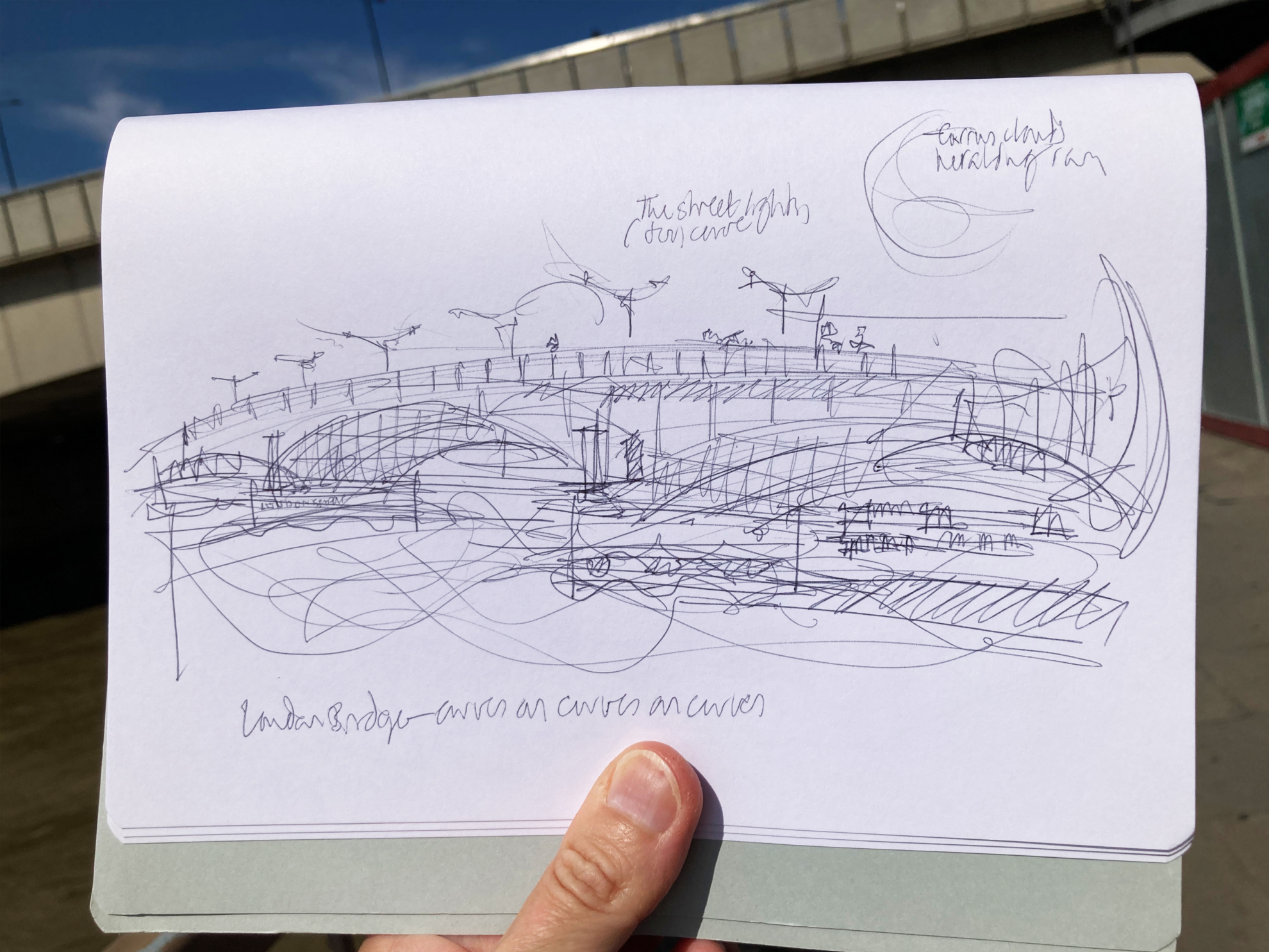 While Jonathan was over in the UK from the US, we walked and talked our way across, under and around London Bridge (me with sketchbook in hand), noticing the line, the light, the shadow, the flow of humans, water and time, the zoetrope of stonework, the coping stones I’d hurried past countless times. I had been fascinated by the haberdasheries that had been the bridge’s last shops: line; water; shadow; ribbon; thread.
