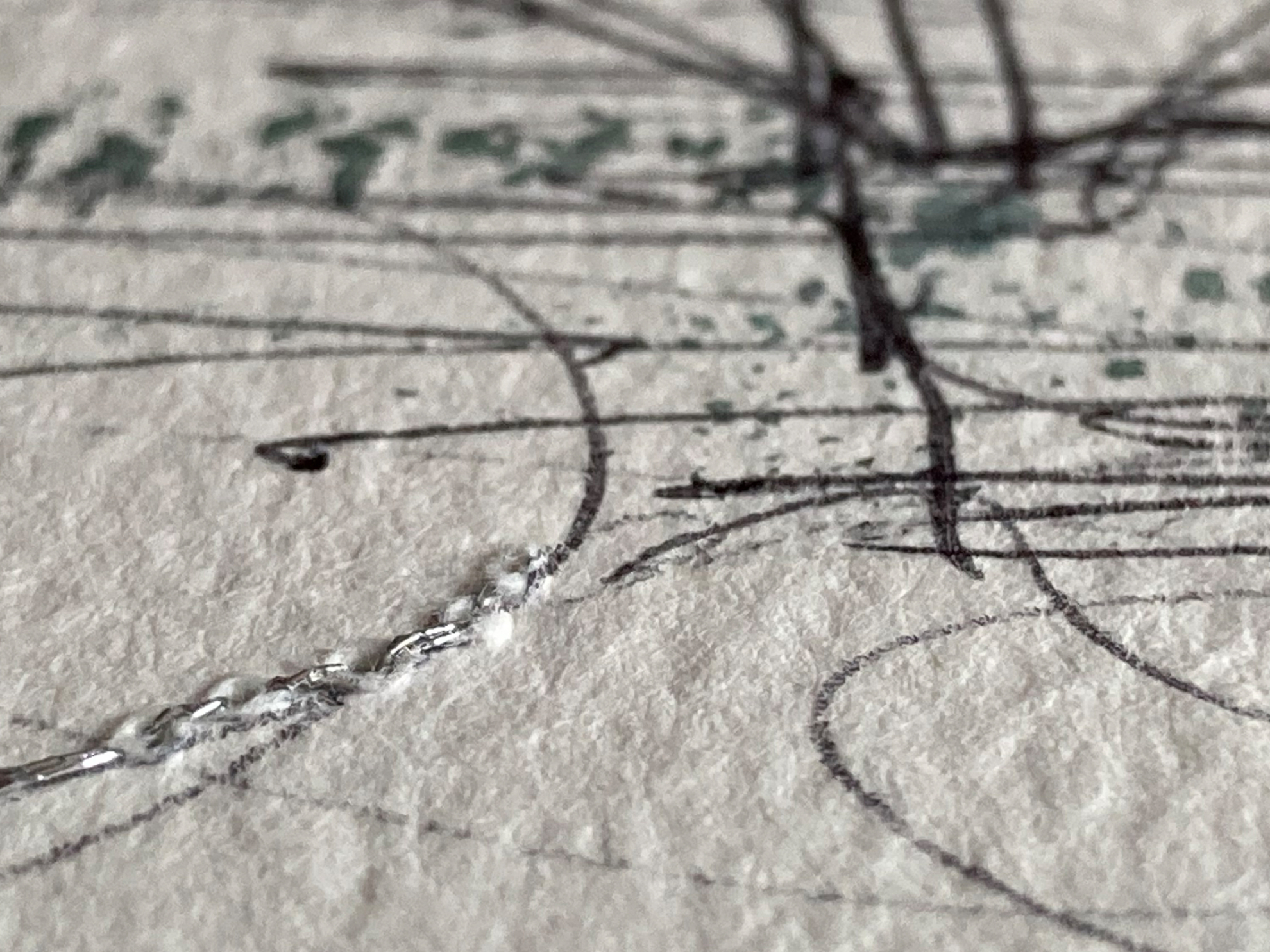 We found ourselves with two pieces, a drawing with monoprinted ribbon and stitching and the edition of lithographs. Stone and liquid kept returning as the visual theme that brought everything together so it’s two of the lithographs that will be auctioned.