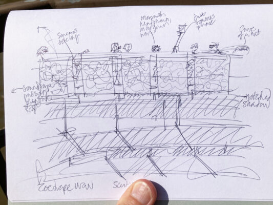 I returned for a sketch walk. There were experiments and test pieces: drawn; monoprinted; stitched. Our conversation of words and images continued by email, across the Atlantic, across time zones.